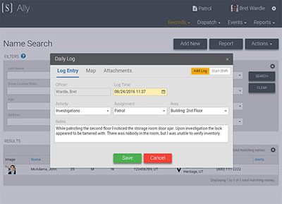 Ally enables private security dispatchers to record all relevant call information on a single record, rather than needing to manually create multiple logs. Users can then access the single log to view a comprehensive call history, complete with comments and timestamps. Because of Ally's system integration, all call data can also be easily searched for using keywords.